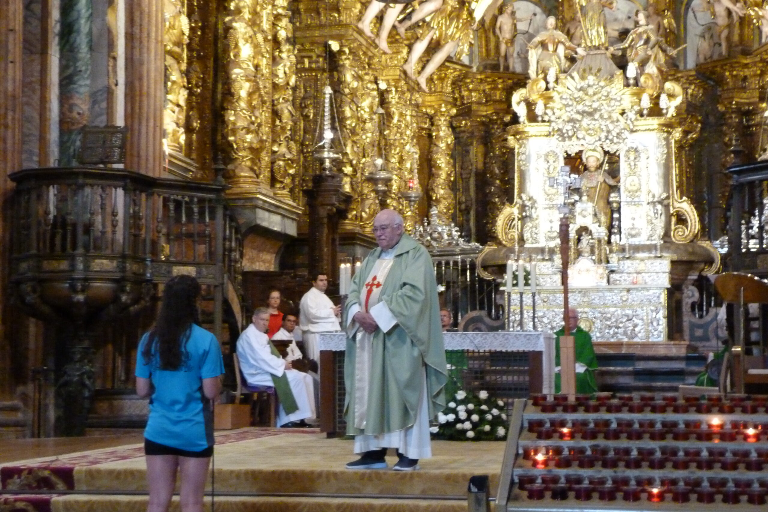 Después salimos con tiempo (la catedral se llena pronto) para la misa del peregrino. Carmen leyó con aplomo y claridad la Invocación al Apóstol en nombre de todos los peregrinos que participaban en esa misa. En la Invocación hablamos del Camino y de Parteluz, de lo hermosos que habían sido los más de treinta años transcurridos. (Haz clic aquí para descargar y leer la invocación)
