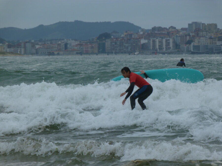 Cargados con nuestro macuto, tiendas, esterillas y muchas ganas, nos reencontramos todos detrás del Museo de la Evolución Humana el miércoles 5 de julio a las 8 de la mañana. De allí partimos hasta Loredo, donde, después de dividirnos en grupos, realizar unas dinámicas de presentación y montar las tiendas de campaña, disfrutamos de una magnífica tarde de juegos en la playa: la misma en la que se celebra el tradicional Derby de Loredo, una carrera de caballos sobre la arena húmeda y con la marea baja. Pero nosotros optamos por recibir una clase de surf. Para algunos era su primera vez practicando este deporte y se echaron más risas que olas, pero eso no le restó diversión.