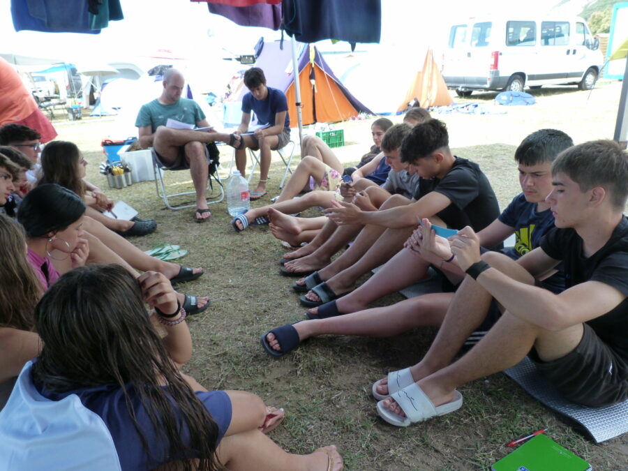 La playa de Berria, que da nombre al camping, tiene casi dos km de longitud, los mismos que la separan del pueblo. Se ubica en un lugar de gran belleza paisajística e interés natural, entre los encinares del Brusco y el Buciero, cerrando por el norte las marismas de Santoña. Allí, pudimos disfrutar de una interesantísima reunión sobre la adicción a los móviles, en la que todos se implicaron y sorprendieron al tomar conciencia del tiempo que desperdiciamos con este aparato y de sus consecuencias. Y por la noche conocimos el testimonio de Antonio, uno de los padres que nos han acompañado este año para la cocina e intendencia, llenando de risas el camping.