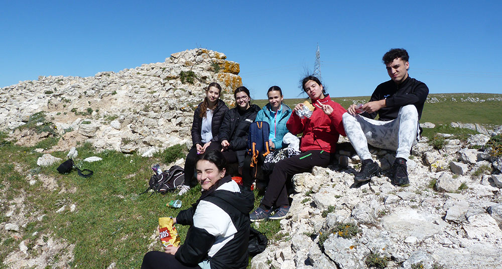 La subida, aunque no era larga, sí era exigente y nos quitó las ganas de hablar y reír que traíamos. Pronto remontamos la ladera rocosa y nos colocamos por encima del valle por el que transcurre la autopista que va a Francia. Por encima de ella reconocimos, en unas lomas de cumbre plana que veíamos al lado contrario del valle, el perfil de una antigua población prerromana que construyó sus defensas allí. Fueron los autrigones, bravo pueblo que hizo difícil la conquista de su villa fortificada, Tritium, a las legiones romanas.