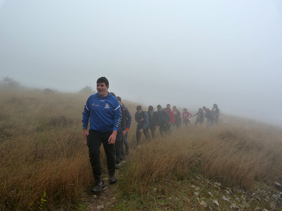 El sábado por la mañana nos encontramos que una niebla espesa cubría el pueblo y algo de lluvia amenazaba con estropearnos la mañana. Como no nos caracteriza echarnos para atrás preventivamente, decidimos iniciar la subida al castillo de santa Engracia. Si la lluvia aumentaba, volveríamos.