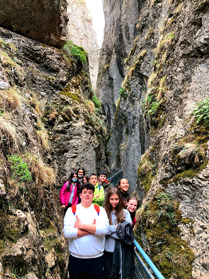 Luego vino la bajada por la cara sur, empinada y con mucho cascajo del que te hace patinar. Como era de prever, no faltó alguna caída de las que divierten a todos menos al que acaba en el suelo. Por allí, llegamos al espectacular desfiladero de la Yecla, recientemente mejorado en su acondicionamiento. Disfrutamos de su impresionante paisaje y, como es de rigor, nos hicimos muchas fotos.