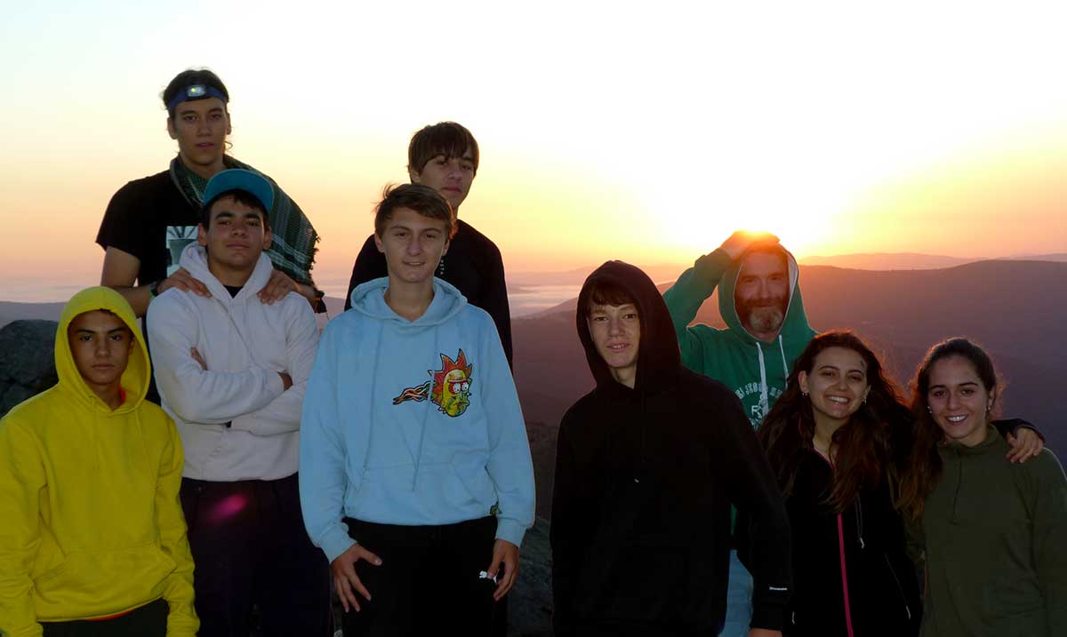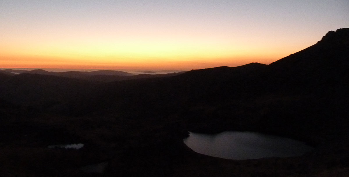 A poco de llegar a la cumbre apareció el círculo de fuego en el horizonte. En silencio contemplamos como emergía lentamente y dejaba que se le mirara. Absortos por el momento permanecimos con los ojos puestos en la bola de fuego hasta que empezó a hacer daño a la vista. Hicimos las fotografías de rigor y bajamos hasta una lagunilla para desayunar.