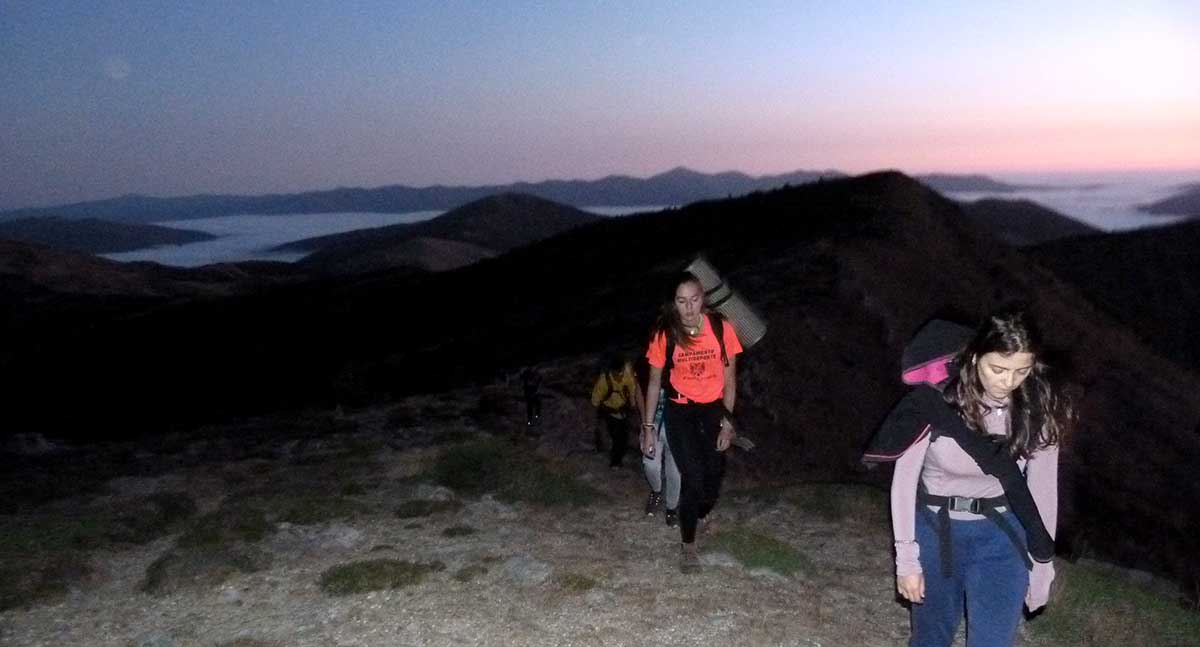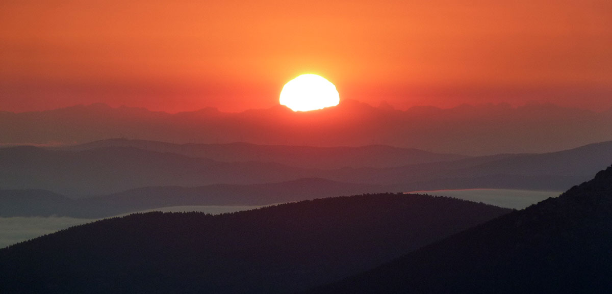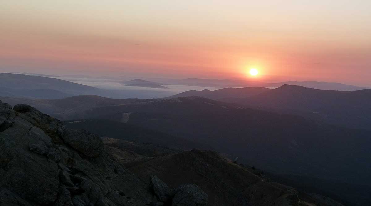 A las 5 de la mañana nos despertamos y recogimos sacos y útiles personales para ponernos en camino. Atravesamos espesuras, pinares y pedreras hasta llegar a la cuerda en la que ya apenas hay vegetación. Dejamos a nuestra espalda las luces, que desde la altura parecen de juguete, de los pueblos serranos. La primera luz empezaba a asomar por el horizonte en forma de una intensa línea rojiza. Entonces se dio la sorpresa: el valle del Ebro estaba cubierto de nubes por debajo de nosotros. A nuestros pies, un enorme mar de nubes cubría el norte dejando a las montañas como islitas que flotaban en él.