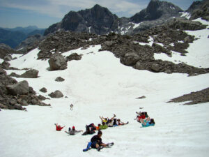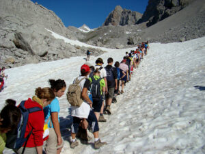 En el descenso aprovecharemos para jugar con la nieve ¡en julio! Incluso, podremos deslizarnos en algunos tramos. Volveremos al teleférico y descenderemos rápidamente hasta nuestro camping con la satisfacción de haber coronado una cumbre importante de casi 2.600 metros sobre el nivel del mar.