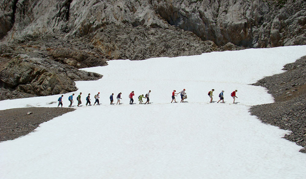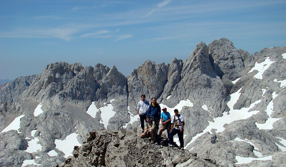 El miércoles 10 será la etapa reina de nuestra travesía. Tomaremos el teleférico que en unos breves momentos nos subirá unos ochocientos metros de desnivel. Desde la estación de arriba contemplaremos el impresionante valle de Fuente Dé. De allí, ascendiendo por roquedos, pedreras y neveros, llegaremos al collado de Horcados Rojos, un impresionante mirador hacia las paredes verticales del Naranco de Bulnes. Con un poco más de esfuerzo llegaremos a la cumbre de Horcados Rojos. Estamos en el medio del macizo central de Picos de Europa. Si el día está claro, veremos el mar, y en cualquier caso veremos los pequeños y grandes neveros que rodean nuestra cumbre.